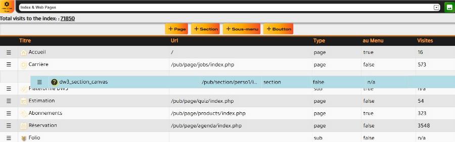 Ensuite vous apercevrez 4 boutons: +Page, +Section, +Sous-menu et +Bouton qui vous offriront un choix de différents éléments.